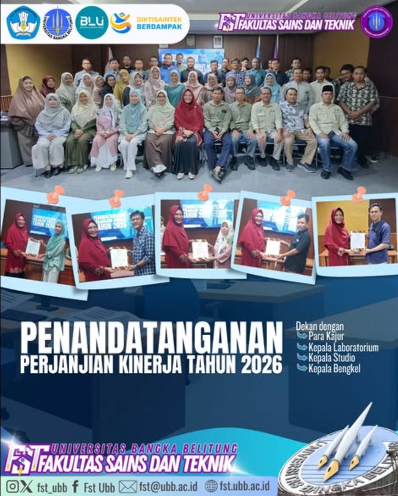 Fakultas Sains dan Teknik (FST) Universitas Bangka Belitung (UBB) menggelar acara penandatanganan Perjanjian Kinerja Tahun 2026 antara Dekan FST dan para Ketua Jurusan dan Kepala Laboratorium/Studio/bengkel sekaligus pisah sambut mutasi tenaga kependidikan pada Rabu, 14 Januari 2026, di Ruang Seminar Gedung Dharma Penelitian. Kegiatan ini menjadi momen strategis untuk memperkuat komitmen kinerja dan transisi jabatan guna mendukung operasional fakultas sepanjang tahun.​